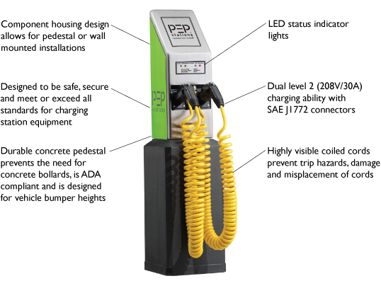 PEP Stations is the original dual Level 2 electric car charging stations provider. For building owners and managers that need electric vehicle charging stations but don't require access management, reporting or monitoring, the PS1500 is the solution. PEP's plug n' go unit offers electric vehicle charging without all the features of the PS2000 while still offering its cutting edge design. PEP's electric car charge stations are represented by Hubbell and serviced by Service USA.